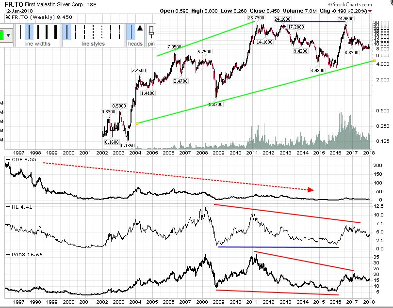 Das heißt: der Hebel des Silbers gegenüber dem Gold im Bullenmarkt ist für WPM ziemlich raus. Dieser Hebel bleibt bei FR (im Rahmen der möglichen Anpassung auf 1:50 - und wir erinnern uns: das langjährige Mittel ist rd. 1:15)