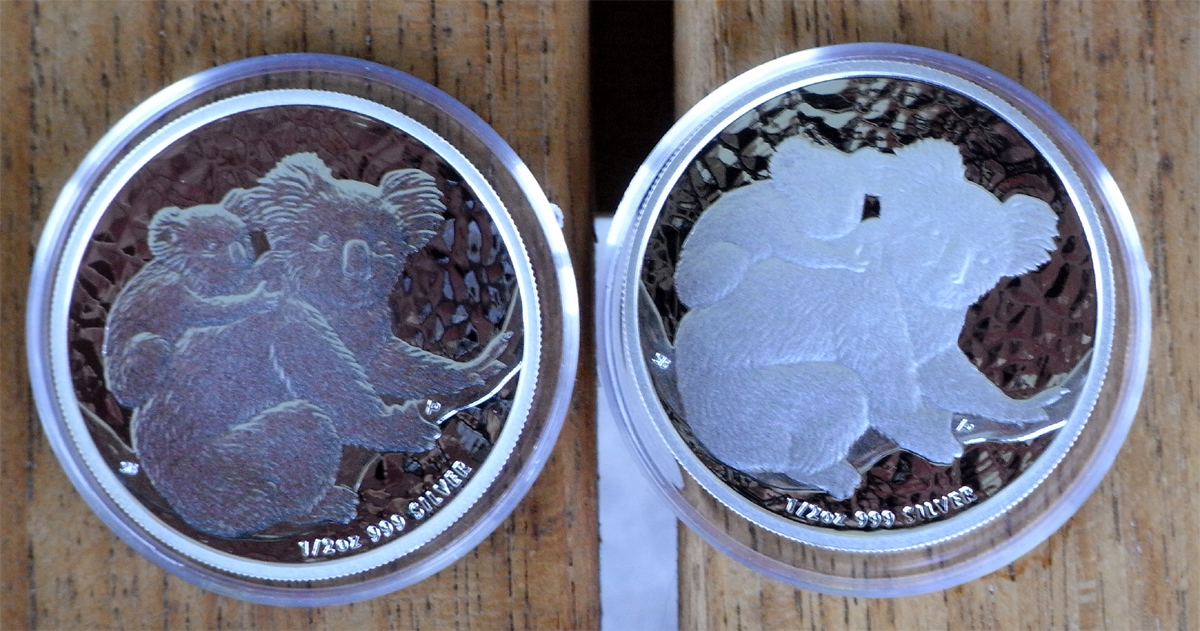 vor mir liegen 2 Stck. 1/2 Oz Koalas aus dem Jahr 2008. Beide sind eindeutig unterschiedlich geprägt, die eine mit einem matten Koala Motiv, die andere eher gleichmäßig schimmernd mit etwas glänzenderem Motiv. Könnt Ihr mir sagen, was es damit auf sich hat?DANKE!!
