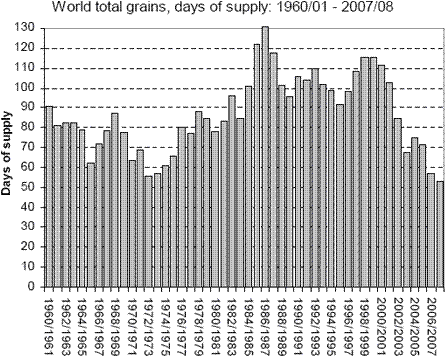 Sehen Sie sich folgende Grafik an, welche einen Überblick über die Entwicklung der weltweiten Getreidebestände in den letzten 50 Jahren gibt - gemessen an der Zeitspanne, die bei durchschnittlichem Verbrauch vorhanden ist.