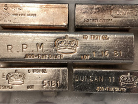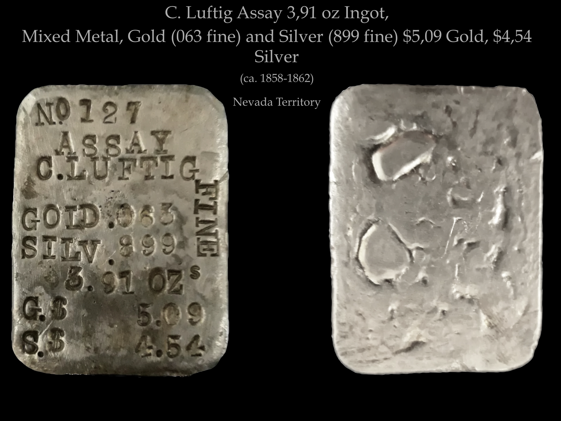 Ein paar California Crown Mint-Varianten mit Gegenstempel, et al.Die oberen beiden sind selbstverständlich keine CCM‘s, passten dafür umso besser ins Gesamtbild: Gussbarren - selbst ein extrudiertes Ag-Stranggusserzeugnis kann von Puristen als ein ebensolchen anerkannt werden.