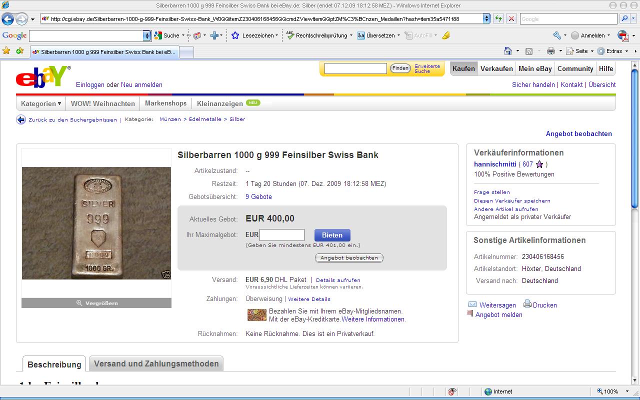 Was bitte ist DAS http://cgi.ebay.de/Silberbarre…illen?hash=item35a5471f88 denn ??! Das wäre das erste mal das ich einen Swiss bank Silberbarren mit der Schoene Taube sehe... Bei Echtheit auf jedenfall ein seltenes Exemplar...