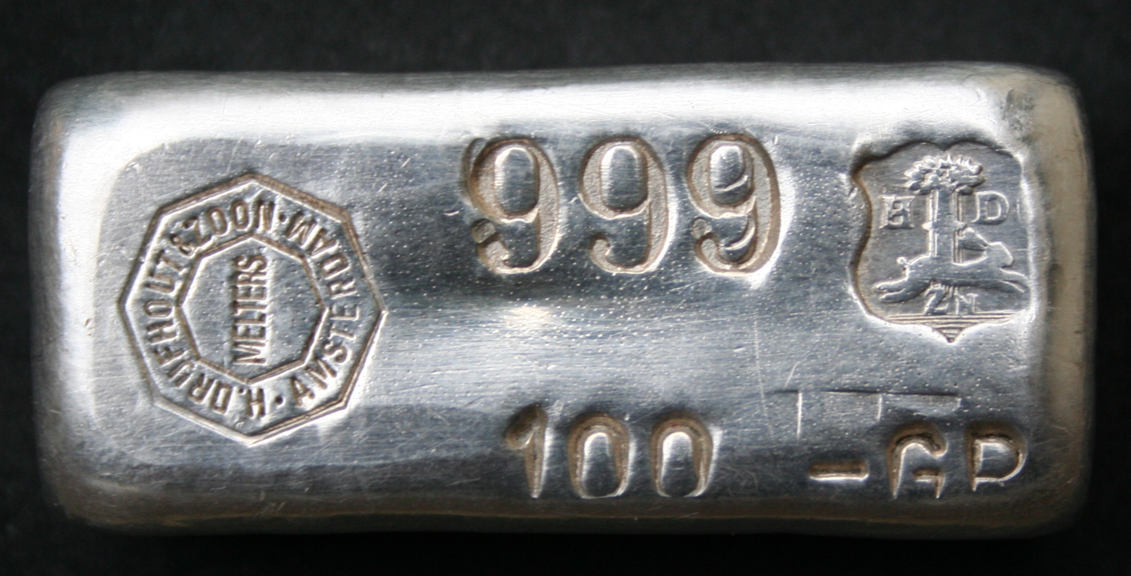 Aus gleichem Hause stammt dieser 100 g Silberbarren mit rückwärtiger Stempelung.
