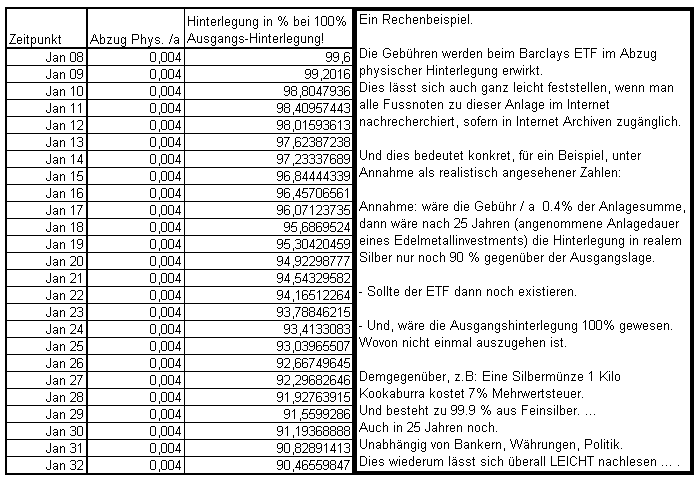 Es ist keineswegs trivial eine solche Art der Finanzierung, die die laufenden Kosten eines als angeblich silbergedeckt ausgeschriebenen, und so auch laut vermarkteten, Finanzvehikels, durch Verringerung eben dieser Silberhinterlegung als Cash-Quelle deckt -  in den Fussnoten der Beschreibungen zu diesem Finanzvehikel zu finden.