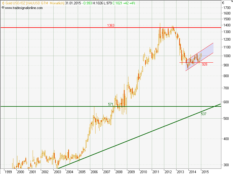 • Schauen wir uns den Euro-Goldchart an...Ob wir nach langer zeit über 1000 schließen werden :hae: :hae: ?? Es wäre ein kleiner Erfolg, aber die Frage die sich stellt, ob das nur ein kleiner Sprung im Bear-Flag ist?? Wörnie hatte es schön aufgezeigt und hier nochmal in groß und langfristig...geht nicht jeder aufwärtskanal mit einer evtl bear-flag einher?? wann hat es keinen bestand mehr, vielleicht kann wörnie dazu mehr sagen??