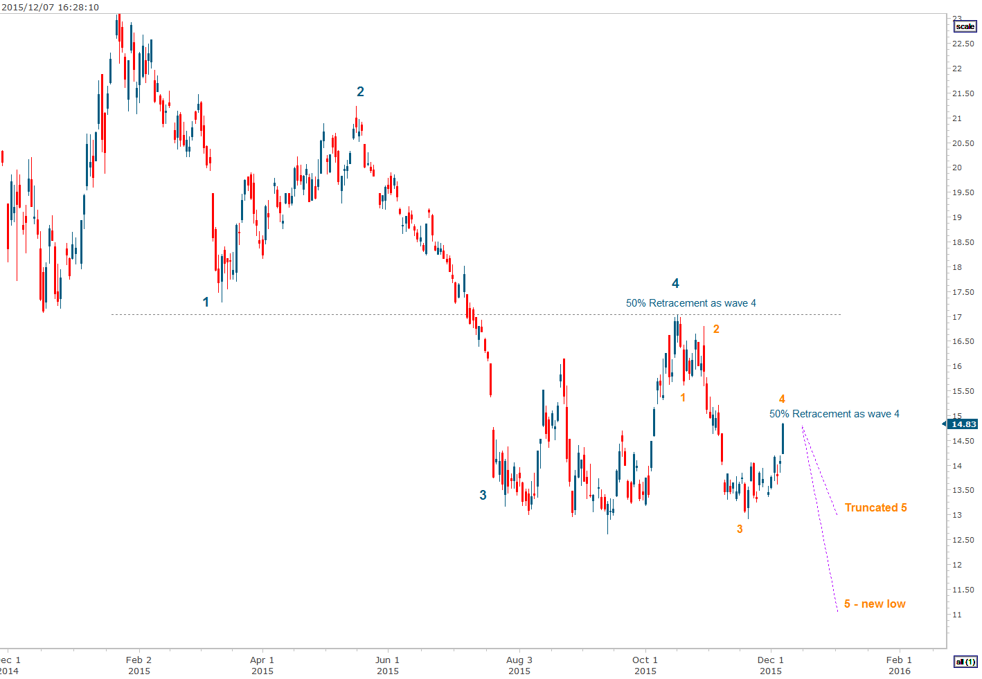 Bei der Beobachtung aktuelle Chartverlauf bin ich in der Meinung das es war nicht der verkürzte Welle 5 - Truncated - gewesen, sondern lediglich Welle 4 noch in der Entwicklung und wahrscheinlich um die 15 USD ist an der TOP der Welle 4, daher LONG raus, und auf SHORT gewechselt.