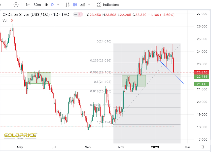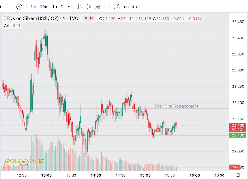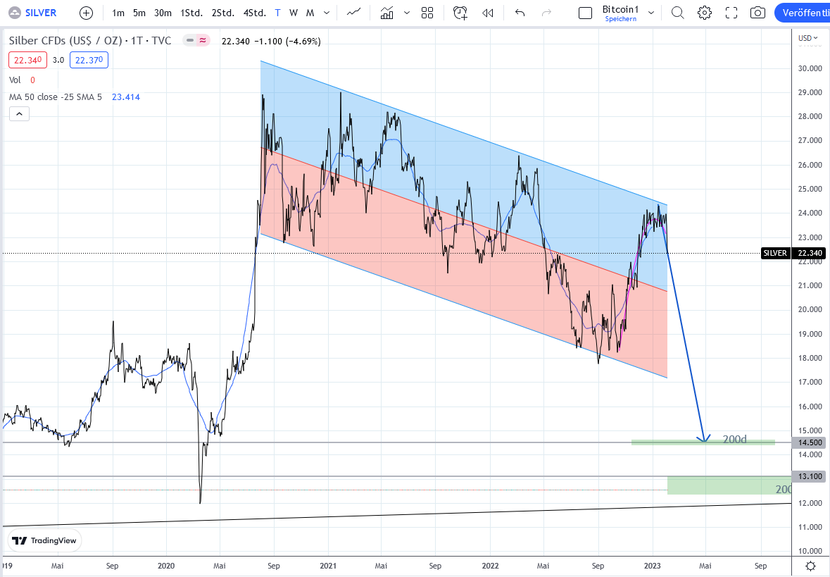 Gestern bin ich bei 24,30 in die Absicherung gegangen, nachdem Silber an der Abwärtstrendlinie gescheitert ist. Der 200-Tagesschnitt liegt irgendwo 21, es wäre schön, wenn Silber hier einen Henkel ausbilden würde.