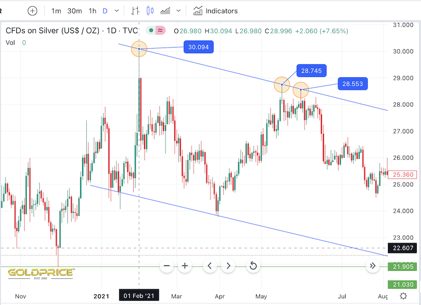 Sehr elegant wäre es, wenn sich der Silberkurs auf diesem Wege korrigiert, und sich gleichzeitig aus dem übergeordneten Abwärtstrend seit 2021 befreit, bzw. diesen von oben erfolgreich testet.