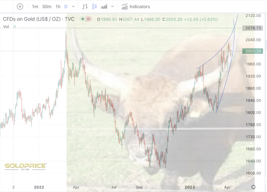 Warum nicht einfach ein Durchmarsch auf 2.150 $ dann Monate seitwärts und dann auf 2.300 $ bis 31.12.2023.