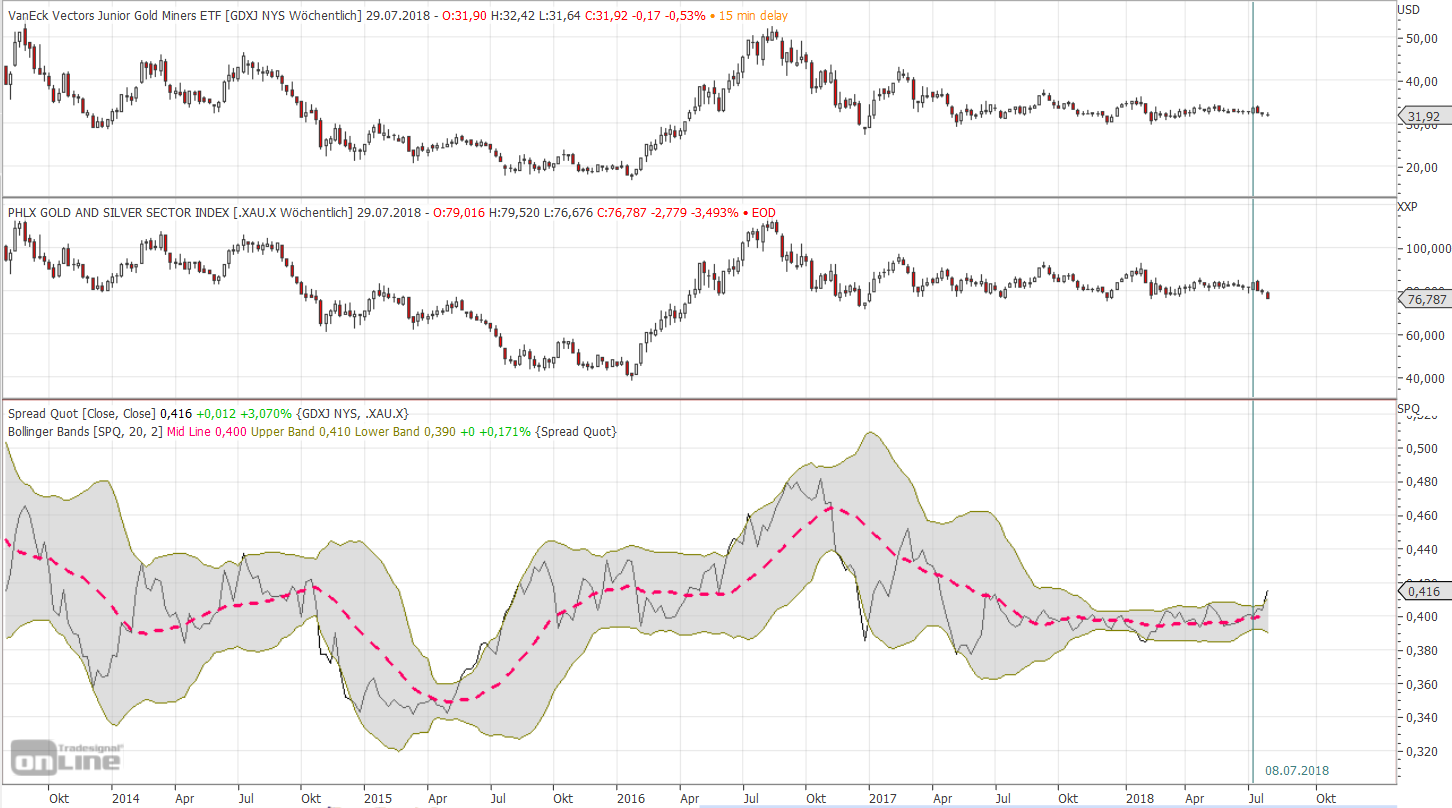 Interessant finde ich die relative Stärke der kleinen Minen (ETF GDXJ) zum XAU.