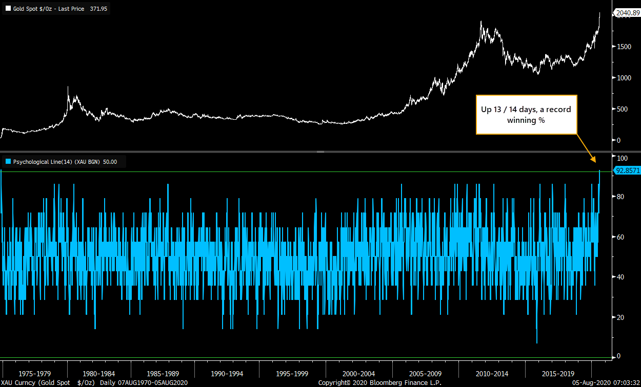 Alles anzeigenDa war er nun der erste merkliche Rücksetzer bis 2015 USD. Hab die Hälfte meines Shorts gestern wieder gegeben, war schon eine sehr starke Performance die vergangenen Handelswochen. RSI nun bei 77. Historisch betrachtet gab es so viele Plustage sogar noch nie, nicht mal im glorreichen Anstieg der 1970er Jahre: