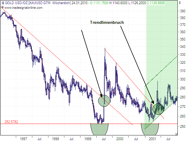 die zweite dann 2001 mit dem nochmaligen anlaufen des alten tief, bzw. wer auf nummer sicher gehen wollte hat den zweiten trendbruch des abwärtstrend seit 1999 abgewartet.