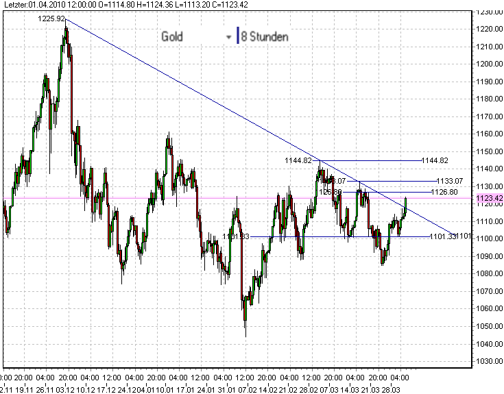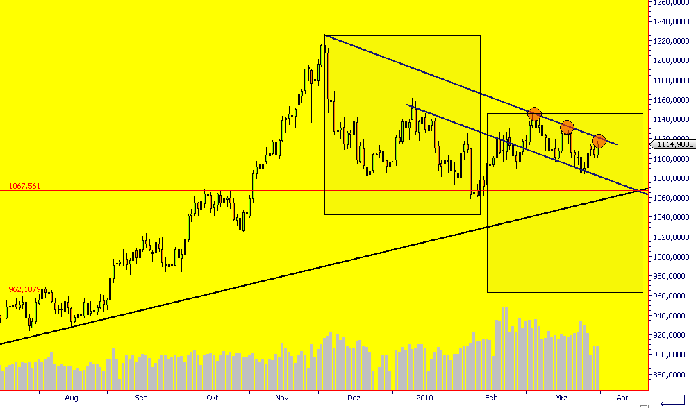 Nun will ich auch meinen Senf dazu geben - Gold ist seit dem Hoch am 03.12.2009 jetzt schon das dritte mal an der Abwärtslinie abgeprallt und aktuell in einem engen Kanal Richtung $ 1070 Passend dazu wäre der 19/20 April.