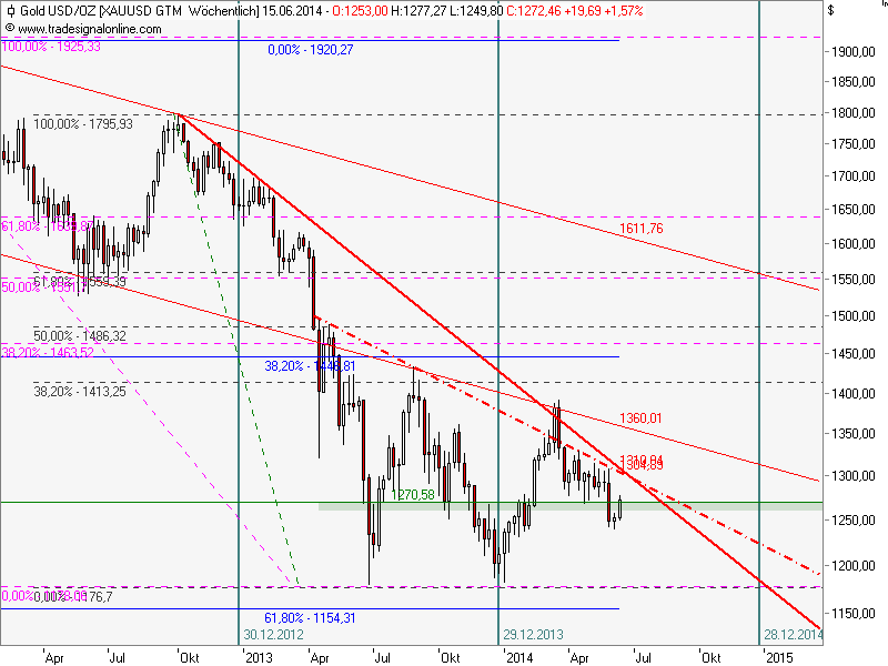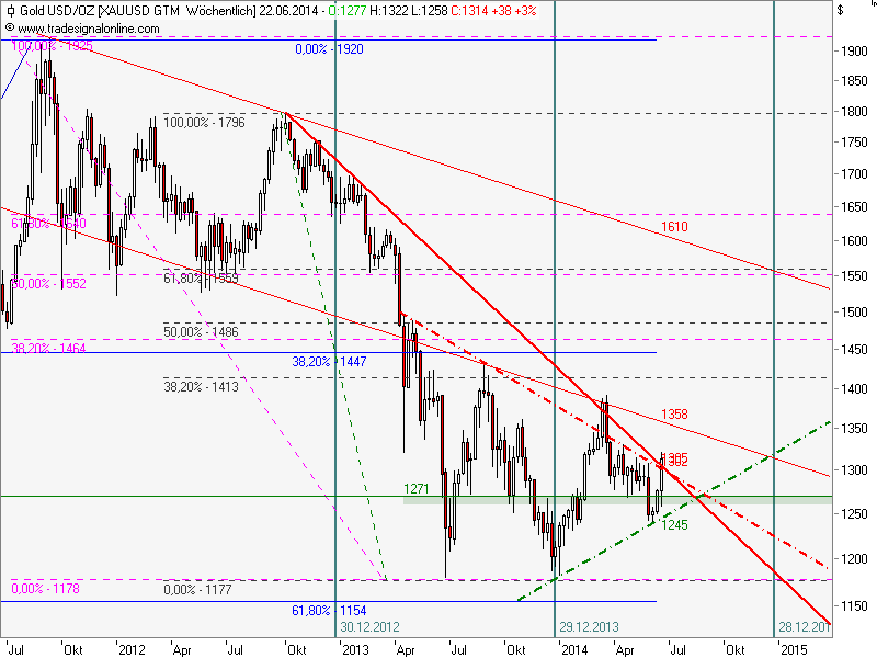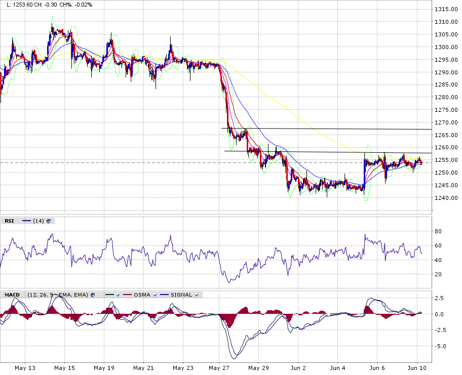 Nachdem im Stundenchart der 20MA geknackt werden konnte, ist das Szenario mit dem schnellen Abverkauf erst mal in weite ferne gerückt. Wie erwartet aber kein schnelles Rally, sondern es sieht tatsächlich bisher nach rounded bottom aus. Nun wird bald eine Entscheidung fallen müssen. Wird es tatsächlich ein rounded bottom, müssten wir jetzt denn eine Etage höher Richtung 1267 vorrücken und nach einer Pause würde es dann eine Bechleunigung nach oben geben. Die Alternative ist nicht besonders attraktiv, denn ein nochmaliges Scheitern hier bei rund 1257 und ein Abrutschen unter 1250 würde wohl das Aus für den rounded bottom bedeuten....