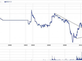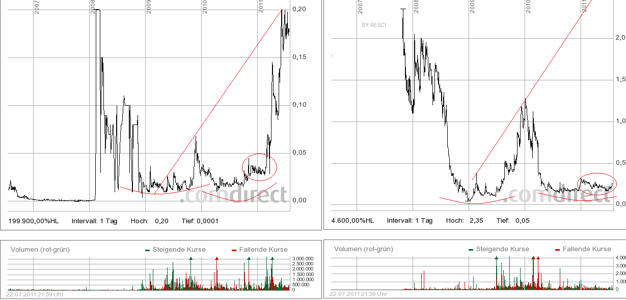 Nov. 2009, als ich als erster hier einstieg, stand der Kurs bei 0,6 C$ und ich prognostizierte bald darauf 2,0 C$, charttechnisch gesehen. Die Situation war ganz ähnlich mit einem gr.Bohrprogramm. Der Kurs alleine aus Fantasie stieg auf 1,28, um dann mit sehr schlechten Bohrproben abzustürzen.