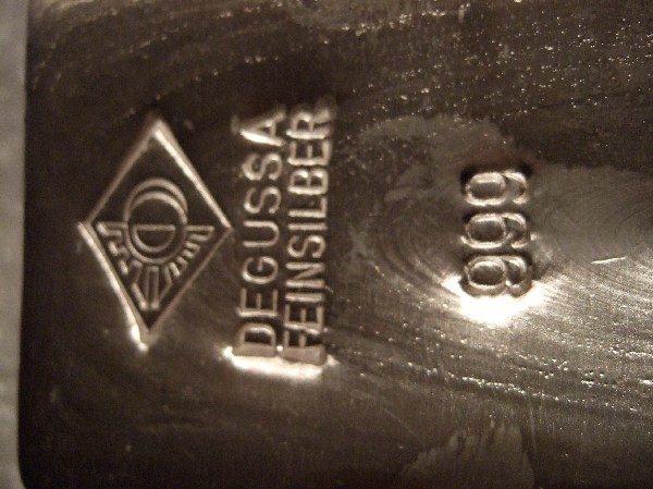 habe einen 5 kg Silberbarren von Degussa. Bilder anbei.
