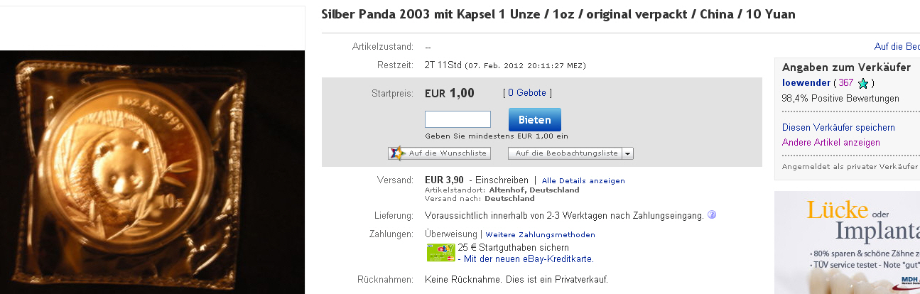 Sie wurden schon mehrmals von Mitglieder des Silberforum angeschrieben und auf diese Fälschung hingewiesen.Leider bekamen die Mitglieder NUR blöde Antworten, ich denke Sie als Gewerblicher Händler wissen ganz genau das diese Münze eine Fälschung ist. Sollte einer unserer Mitglieder diese Münze ersteigern, bekommen Sie eine Anzeige wegen Vertreibung von Falschgeld sowie Betrug!!