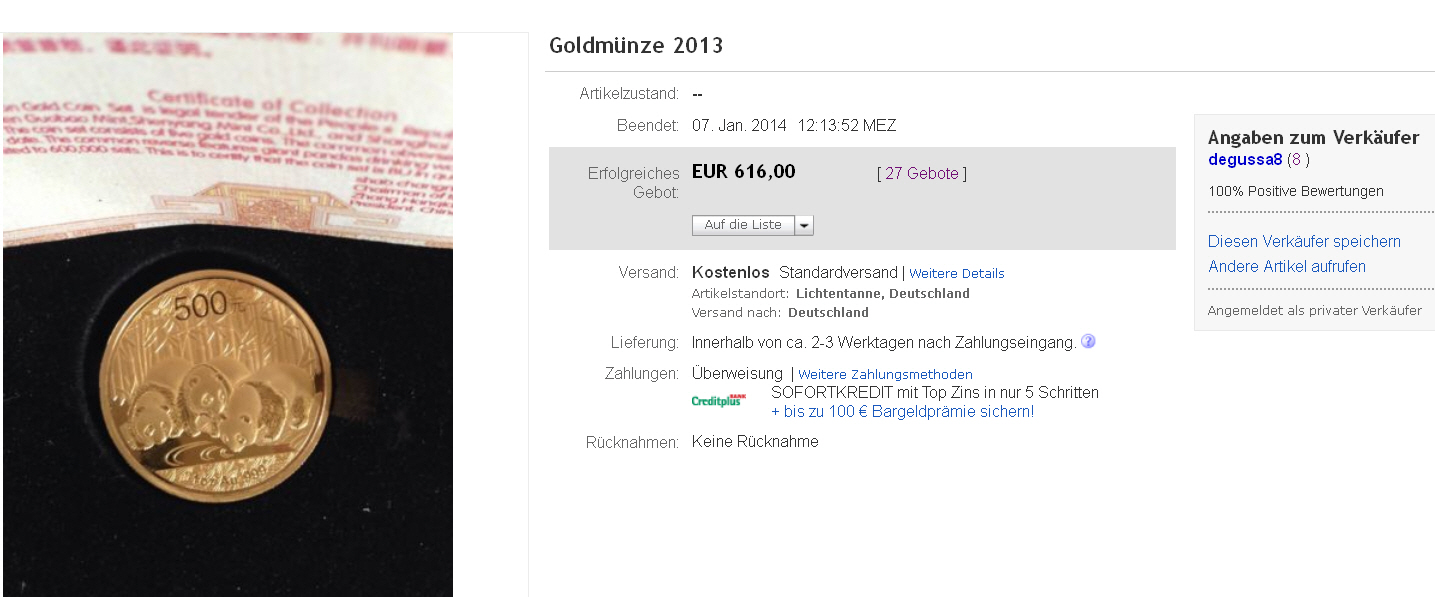 Käufer: d***u ( 8 ) 28.12.13 12:58 Gold Panda Set , Gold Coin's (Nr.281233040967)EUR 800,00Artikel aufrufen