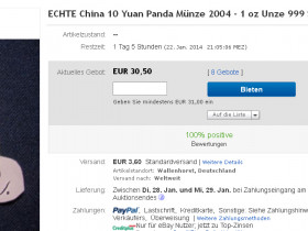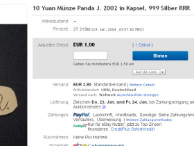 1***1 ( 130[Blockierte Grafik: http://q.ebaystatic.com/aw/pics/icon/iconTealStar_25x25.gif]) 21.12.13 18:17 2000 China Panda Münze 10 Yuan (Nr.181276013273)EUR 24,40Artikel aufrufen