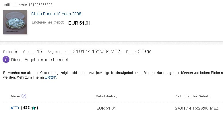 Am 29.01.14 hat der Verkäufer die folgenden Angaben hinzugefügt:da ich x Anfragen und Hinweise bekommen habe das diese Münze eine Fälschung ist nehme ich sie aus der Versteigerung.Diese Sammler wissen wohl nicht das es mindestens 3 Varianten gibt und diese sehr Selten.Ich werde dafür einen Panda mit matten Ring einstellen,dieser hat leider eine kleine patina oben rechts