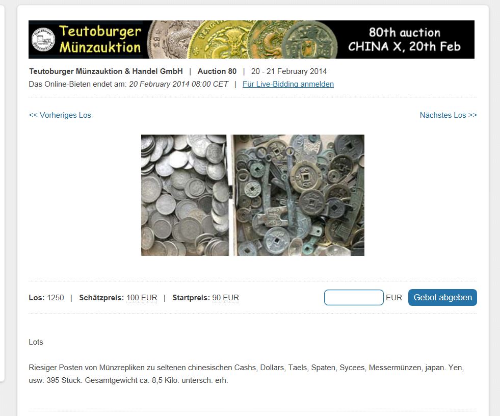 "Riesiger Posten von Münzrepliken zu seltenen chinesischen Cashs, Dollars, Taels, Spaten, Sycees, Messermünzen, japan. Yen, usw. 395 Stück. Gesamtgewicht ca. 8,5 Kilo. untersch. erh." Startpreis 90 Euro