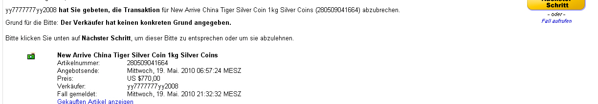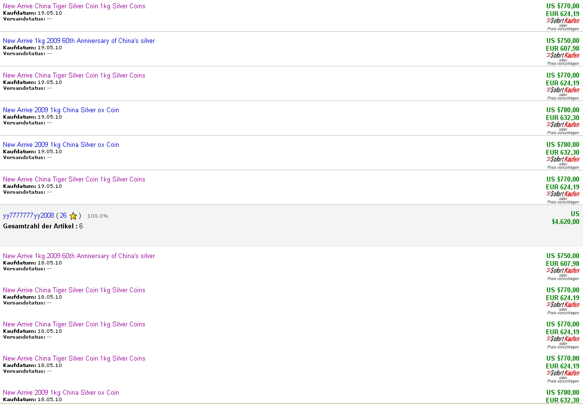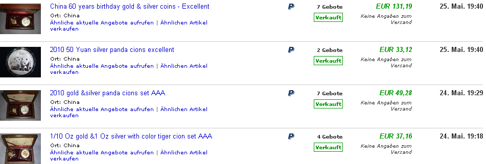 Hach ich stell mir das schön lustig vor. Man nimmt sich Sonntags zum Kaffee trinken eine Auktion vor, irgend so ein 24k Panda Münzchen und ersteigert das mal für einen hübsch hohen Betrag. Sollte richtig hoch sein. (Voraussetzung Nennwert ist drauf und Kopie des Originals natürlich) Tja und dann bezahlt man nicht. Das ist der echt fiese Part. Man wird bestimmt dann eine handlungsstimulierende Email bekommen. Falls der Verkäufer echt weiterhin aktiv bleibt um zumindest die 8% Marge von Ebay einzufordern (die hoch ist), kann man ja ihn auf StGB146-147 hinweisen. Ebay sollte einen decken/sich raushalten. Die Zirkulation von Falschgeld sollte auf jeden fall ein knockout Kriterium für jedes Argument des Verkäufers sein. Ich stell mich ja auch nicht im Supermarkt in die Schlange um der Verkäuferin einen falschen 20 Euro Schein in die Hand zu drücken mit der Bemerkung „hab ich auf den Dachboden gefunden… von Opa!!“. So wird’s nicht legitimer.