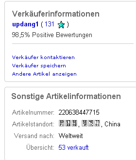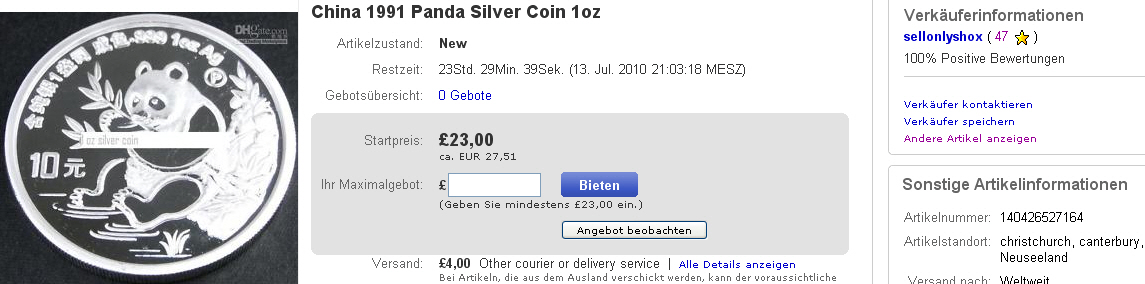 Das ergab ein tel mit paypal und ein zugeschicktes mail von ebay. Ebay habe ich mitgeteilt, dass sie es sich zu einfach machen, da sie aktiv helfen falschgeld unter die leute zu bringen (panda = offizielles zahlungsmittel).