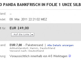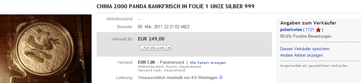 vielleicht ändert sich dann was.Das mach ich ja auch schon ; habe mich allerdings nicht auf Pandas spezialisiert wie Du, sondern ganz allgemein auf Fakes ( wie z.B. 5 DM, Weimar Gedenkmünzen, Kaiserreich Goldmünzen, 1 Gramm "Münzen" etc etc etc. ).