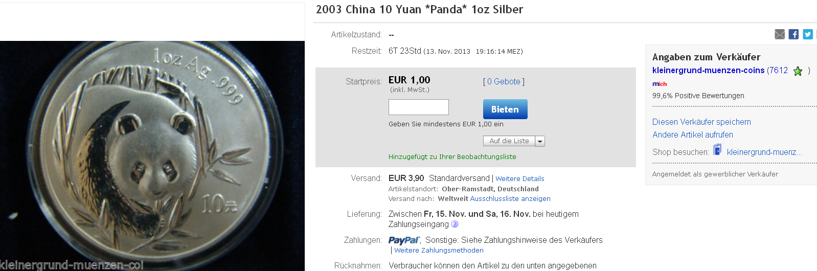 Da von diesen Münzen wohl auch Fälschungen gibt habe ich den auf ebay erstellten Ratgeber für die Echtheit von Panda Müzen zur Rate gezogen.