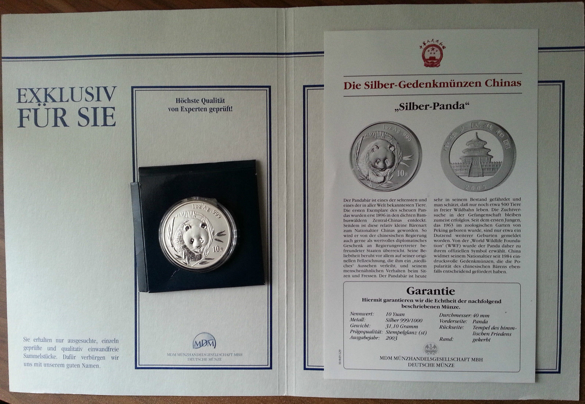 Zu Ihrer Frage: Die Pandamünze auf die Sie sich beziehen und die ich aktuell über Ebay anbiete ist über jeden Zweifel erhaben, da sie absolut Original ist. Ich bin selbst Pandamünzensammler und achte hierbei sehr auf Qualität und Originalität, etwas Anderes kommt für mich selbstverständlich nicht in Frage. Lieber etwas mehr Geld hierfür ausgeben, als auf eine Fälschung hereinfallen. Das war und ist mein Sammlerprinzip.