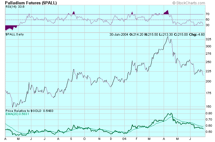 Bei Palladium, wo Russland mit einem Anteil von rund 42% wichtigster Produzent ist, hat das Defizit laut dem Bericht seit 1999 deutlich nachgelassen, vor allem deshalb, weil die früheren hohen Preise zu reduzierter Nachfrage bei Katalysatoren und im Elektroniksektor geführt haben. Gleichzeitig stieg die Produktion um 14%. Laut GFMS sind die russischen Lagerbestände im vergangenen Jahr deutlich zurückgegangen, was dazu führen könnte, dass der Preis wieder zu steigen beginnt, ausser die Angebotslücke würde durch eine erhöhte Produktion geschlossen.