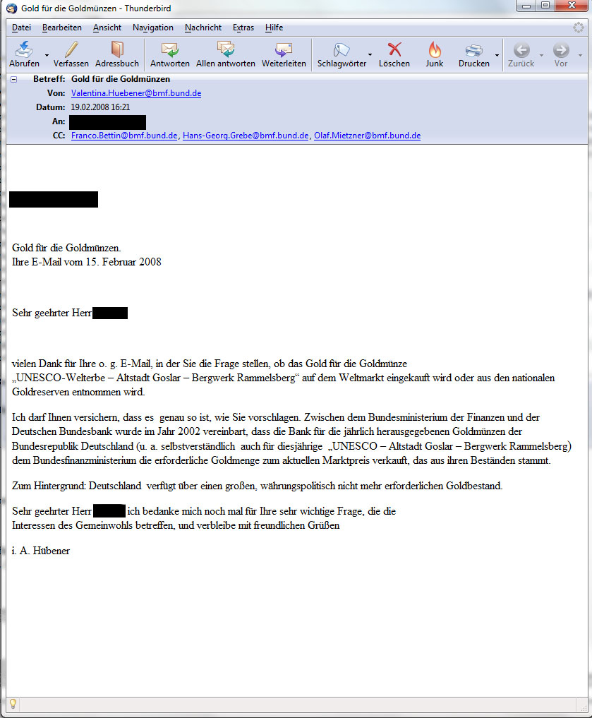 Vielen Dank für diese Antwortmail, wo bestätig wird, dass die Münzen aus Bundesbankgold geprägt werden. Das klärt schon mal einiges. -