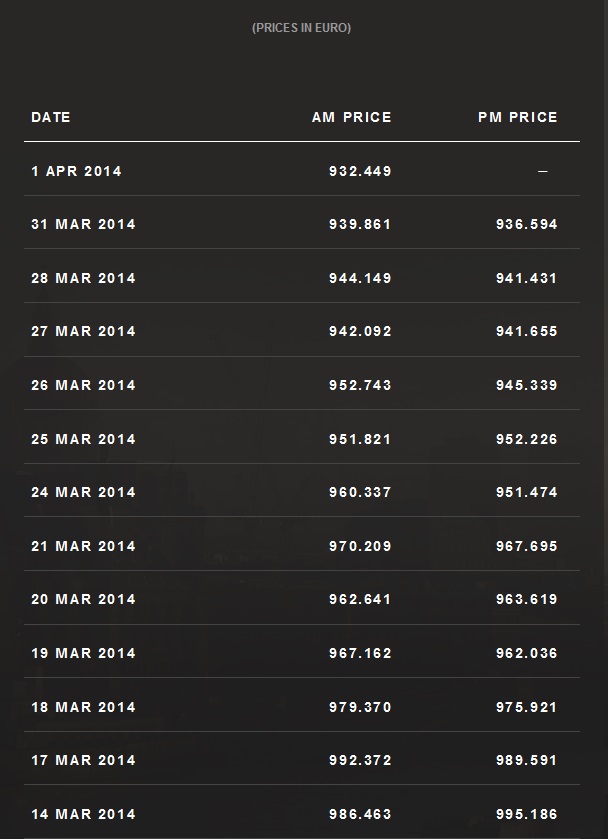 es lässt sich bei aller Logig nicht errechnen wie dieses Verhältnis mit den 20ern und den 100ern zusammenpasst. Überhaupt stellt sich hierbei die Frage welche Grundlage für den bekanntgegebenen Preis existiert? Diese Preise stimmen auch mit den Fix-Preisen im gesamten Zeitraum nicht überein. Wenn das Schreiben mit dem 19.03. datiert, ist anzunehmen das um den Zeitraum herum, bzw kurz davor der Preis für die Oz zugrunde liegen müsste. Die Daten zeigen allerdings folgendes Bild:Zitat