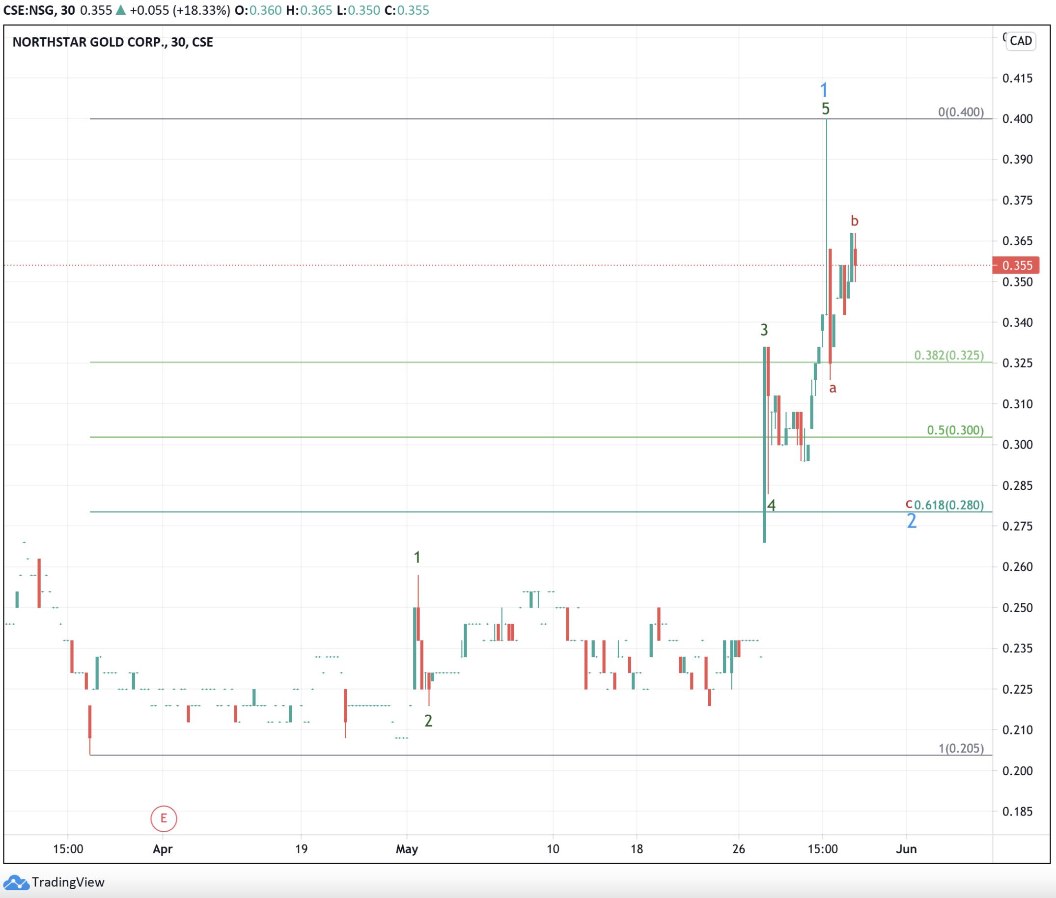 • Evtl. könnte der Kurs noch ein letztes Mal zurück kommen sofern ein kompletter erster Aufwärtsimpuls bei 0,40 C$ abgeschlossen wurde.