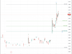 Die a ging nur minimal über das 38,2 % Retracement hinaus. Die b wurde bislang 56,3 % der a lang und mit 100 % der a kommt man genau zur Unterwelle 4 bei 0,285 C$ und ziemlich genau zum 61,8 % Retracement bei 0,28 C$.