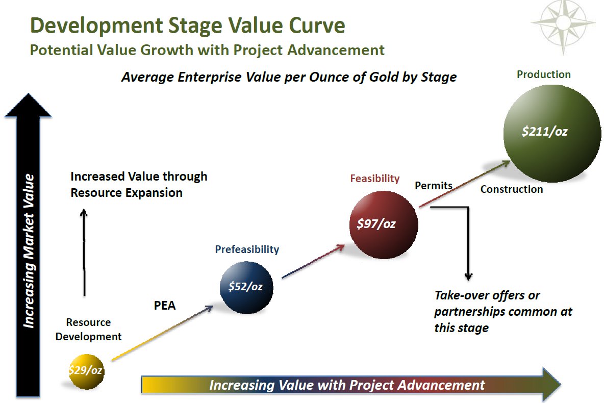 Insbesondere an der Bewertung der Reserven/Ressourcen von schon produzierenden Minen, mit gerade mal $ 211/oz, zeigt sich, wie viel Luft da nach oben noch ist. Zudem lässt sich schön sehen, welche Gewinnspanne (Börsenbewertung pro Unze) für die Großen im Minengeschäft drin ist, wenn sie einen Explorer schlucken.