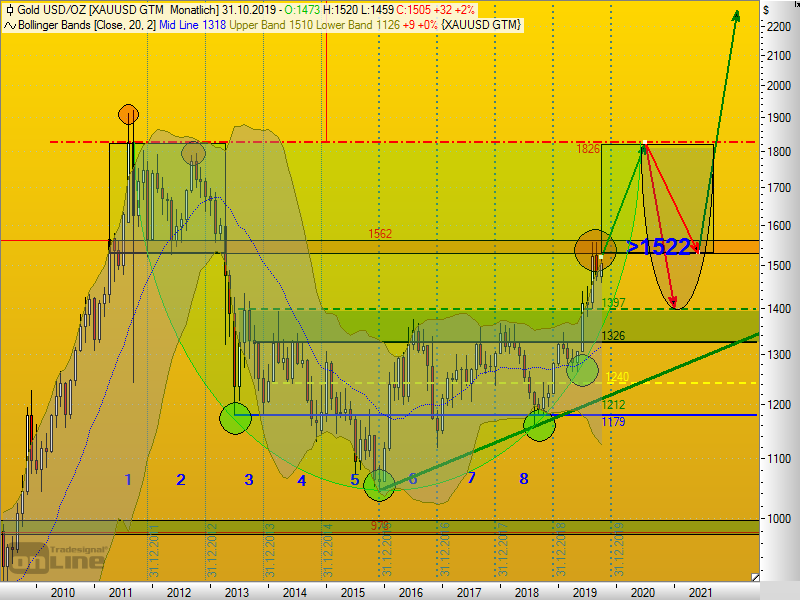 Einige namhafte Analysten sehen zuerst auch noch einen deutlichen Anstieg bis ca. 1700 und dann einen fast schon dramatischen Einbruch Richtung 1000 bis 1200 ungefähr, und das schon in den nächsten Monaten.