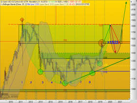 Deine 1 ist bei mir auch die 1, die 2 jedoch bei 1.125 $ Ende 2016. Deine 2 ist bei mir die 3.2 und die 3.3 ist das was gerade läuft und evtl. noch bis ca. 1.700 $ gehen könnte. Danach die 3.4 wieder in den aktuellen Bereich und die 3.5 zum Allzeit-Hoch. Dann die 4 wieder in etwa in den derzeitigen Bereich und die 5 dann in Richtung 2.500 $+.