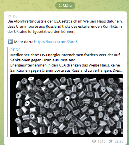 Aufgrund der Kriegshandlungen und den damit verbundenen Sanktionen des Westens, sieht es so aus, als ob auch Kasachstan, Usbekistan usw. und somit über 50% des derzeit geförderten Urans in irgendeiner Form sanktioniert werden könnten - so ist jedenfalls meine derzeitige Einschätzung.