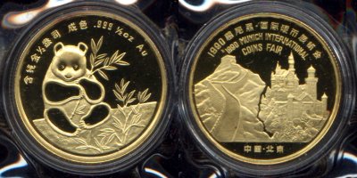 Die Münze die Du meinst ist eigentlich eine Medaille (siehe hier). Auch zur Münzshow wurden diese Medaillen ausgeben. Mit den Pandamünzen haben diese bis auf das Motiv aus meiner Sicht nicht viel gemein.