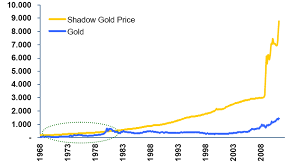 Der Schatten Gold Preis ist ein theoretischer Preis und gibt an, wie viel USD eine Unze Gold kosten würde, wenn die komplette Basis-Geldmenge mit Gold gedeckt wäre. Wenn man nach dem Federal Reserve Act aus 1914 von einer Golddeckung von 40% ausgeht, ist dieser Schatten Gold Preis kein Gedankenspiel, da noch vor Jahrzehnten unsere Währungen mit Gold gedeckt waren. Aufgrund der Geldmengenerhöhung lag der Schatten Gold Preis schon 2011 bei USD 10.000,- je Unze.