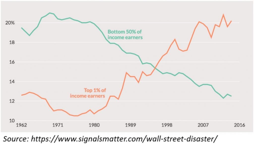 Hier ein Beispiel der CEO Gehaltsentwicklung zum einen, zum anderen der Unterschied zw. den Top 1 und unteren 50 % der Einkommen in USA.