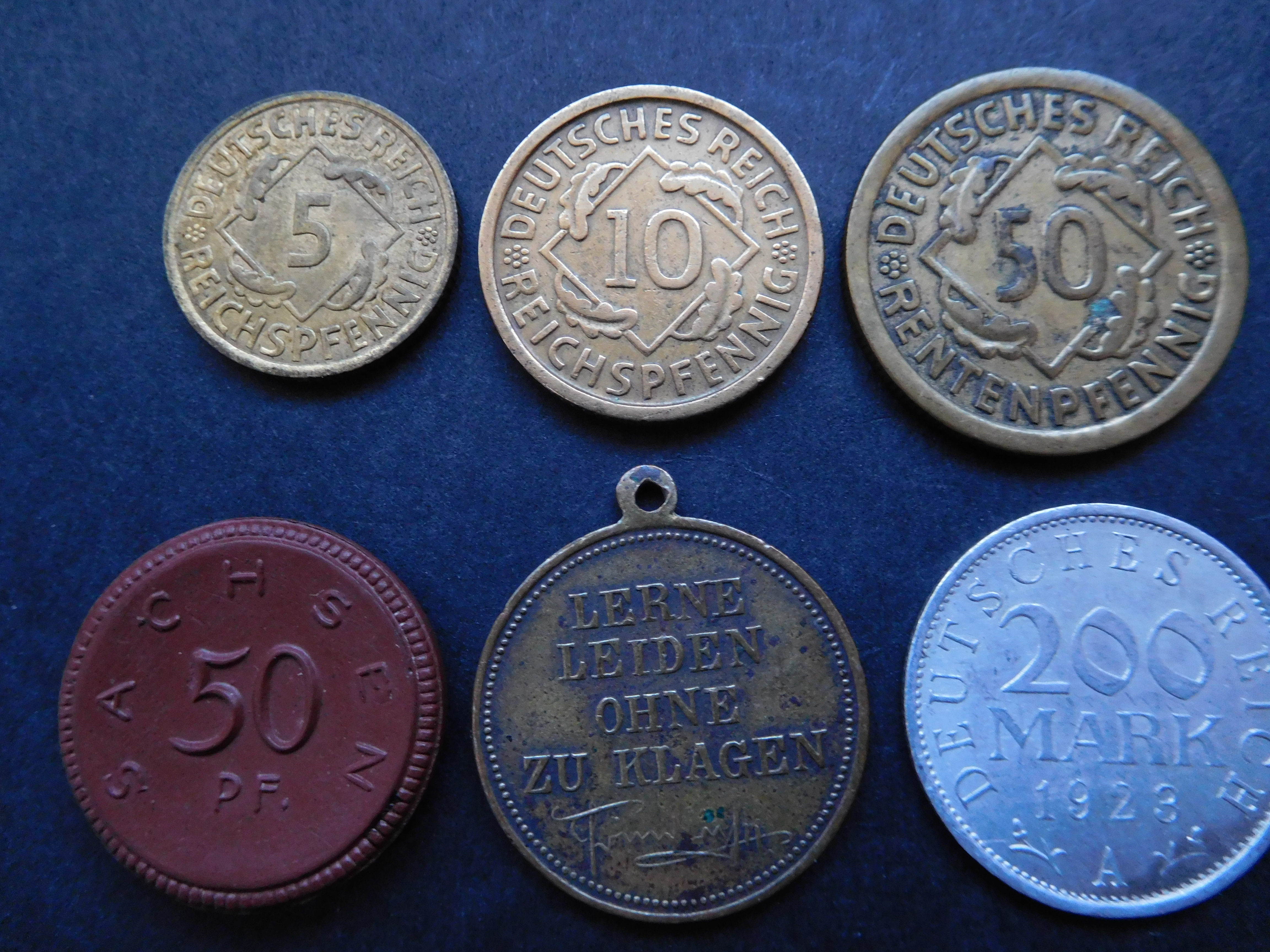 da muss ich Dich leider enttäuschen. Die gezeigten Münzen werden wohl so schwerlich einen Käufer finden. Vielleicht bekommst Du für das 50 Pf Porzellan-Notgeld um die 3-4 EUR und für das 50 Pf. Weimar 1924 F um die 1-2 EUR. Also alles zusammen in die Bucht setzen und anschließend den Erlös in ein Eis verwandeln