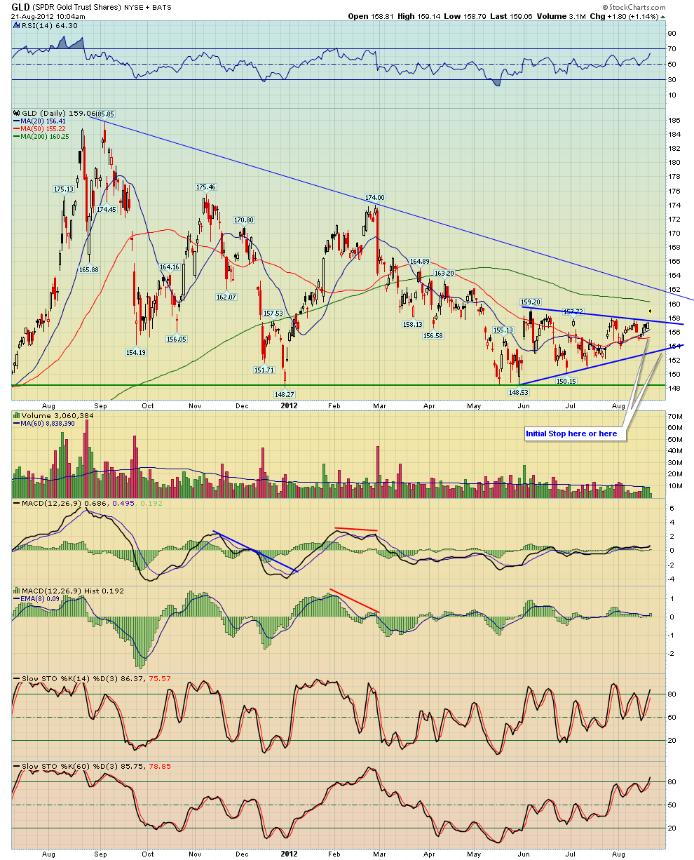 Top oder Boden? oder etwas dazwischen. Ich meine, dass Gold ganz gut dasteht. Nachdem die erste Hürde genommen und behauptet wurde (siehe Chart von GLD) steht Gold nun einmal mehr im Bereich 1625 bis 1630 an (rund 158 beim GLD), ich meine aber, die Unterstützung bei rund 1600 (GLD 155) ist jetzt aber sehr stark und ich sehe grössere Chancen für höhere Kurse bis zur letzten!!!! Downtrendlinie. Von da könnte es dann zur nächst grösseren Korrektur (vielleicht wieder zurück in den aktuellen Bereich) kommen, bevor dann auch noch diese letzte Hürde genommen wird.....