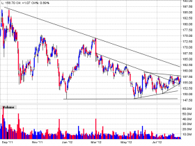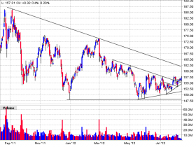 Außerdem wird die gebogene Unterstützungslinie, die sich seit Mai gebildet hat, immer steiler was eher für einen Ausbruch spricht.