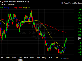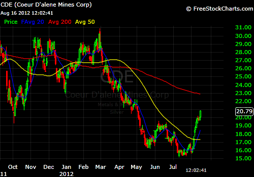 Nun steht offenbar wieder ein Test auf der oberen Seite an. Ein Durchbruch hier, und die Bullen haben nur noch eine Sorge vor (über) sich...Goldaktien sind zwar noch einige im Land der Tränen, aber die eine oder andere könnte die Richtung angegeben haben, wie z.B CDE, die ich mit Gewinnmitnahmen leider schon längst aus dem Depot geschossen habe.....