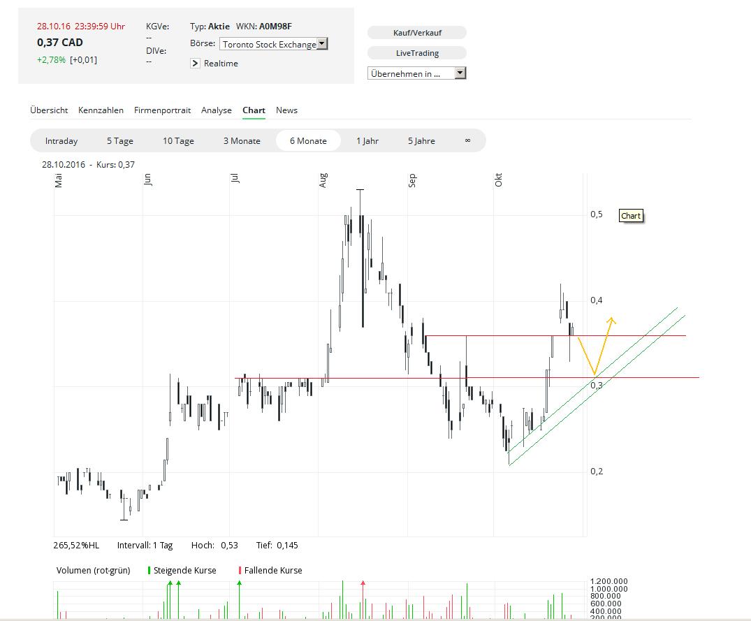 Wichtig für diesen Verlauf wäre es, dass der Kurs jetzt nicht mehr deutlich unter 0,28 C$ fallen sollte und natürlich nicht unter 0,24 C$.