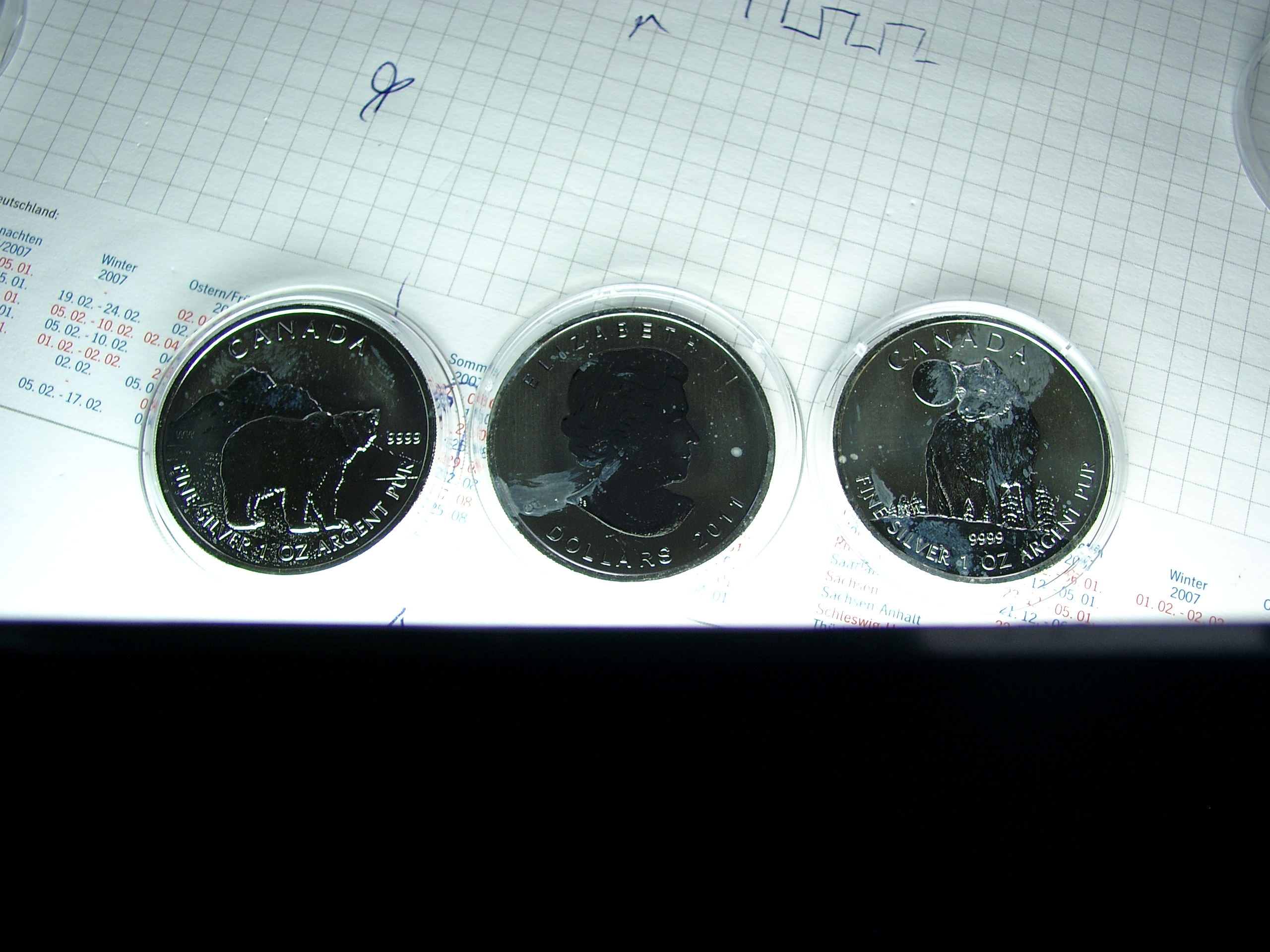 Wenn die Münzen frisch sind, sind die Milchflecken nur leicht. Wenn man die Münzen wie im Anhang von der Seite mit starkem Licht beleuchtet, sodass das Silber "schwarz" aussieht (weil kein Licht vom Silber selbst zurückreflektiert wird), dann sieht man sehr deutlich die Milchflecken, die das Licht in alle Richtungen streuen.