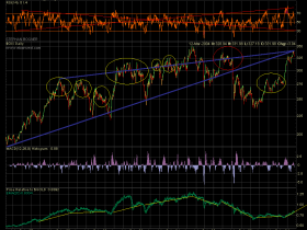 As gold stock traders, our signals come from the $HUI, however, understanding the movement of the price of gold (POG), and being familiar with its charts, will help to ease the fear and provide confidence at times when the market sentiment is overwhelmingly bearish. It ain’t hard to understand the constant fear we gold traders often find ourselves in, after all, its been a 20 year bear market for gold, and I bet if tech stocks just came out of a 20 year bear market, you’ll feel the same way.