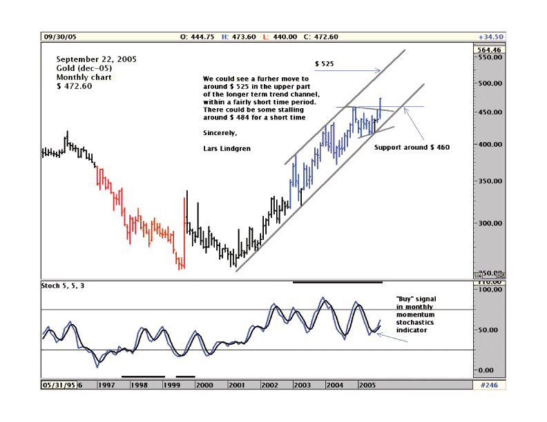 Behold the breakout for gold in the United States. The 470 level was penetrated on the December futures contract, but not quite on the spot market. My target from the chart is 495, with a flirt of 500 before the end of Jan2006. It could come as quickly as a thief in the night, and hit the 500 psychological objective before Christmas.