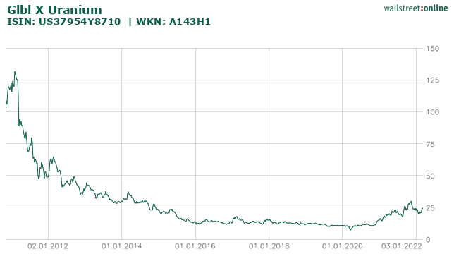 Ich bin zwar auch nicht in diesem oder anderen ETFs investiert, aber der Chart des ETFs zeigt auf, wohin die Reise bei den Uranminen noch gehen könnte. Bei Einzelaktien sieht's teilweise noch weitaus extremer aus.
